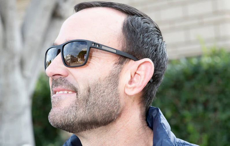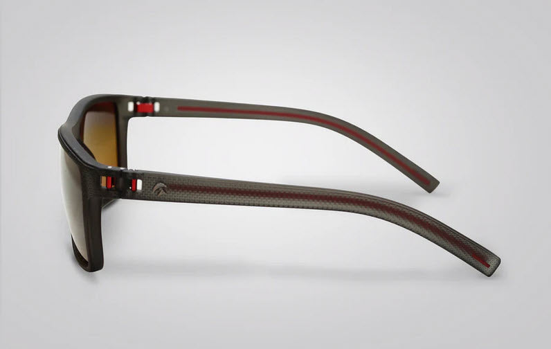 The lightweight but durable Grilamid® TR-90 frames are available in matte black with subtle gray accents, or a dark, translucent gray with subtle red accents.